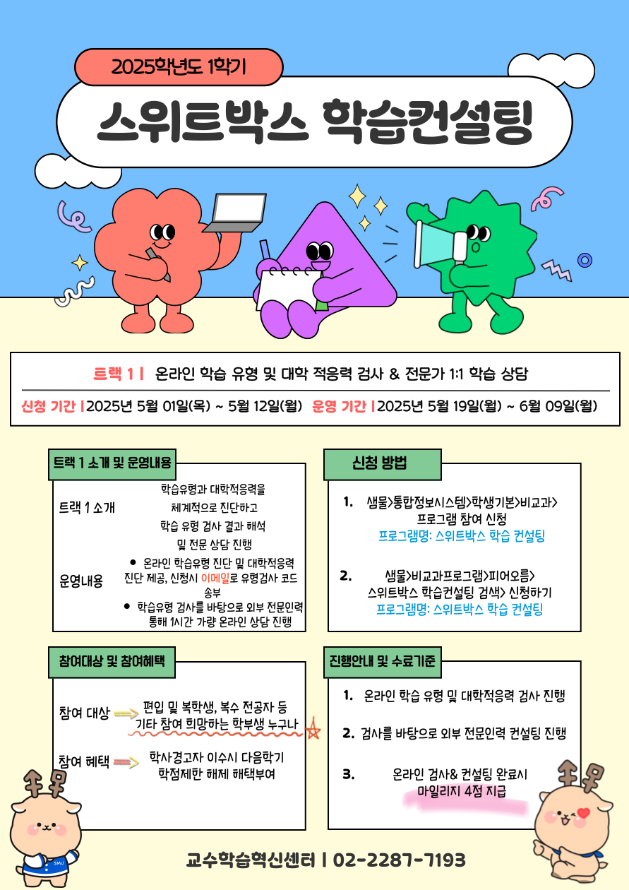 | 서울 [비교과] | [교수학습혁신센터지원팀(서울)]2025학년도 1학기 스위트박스 학습컨설팅 모집 안내_트랙1 |